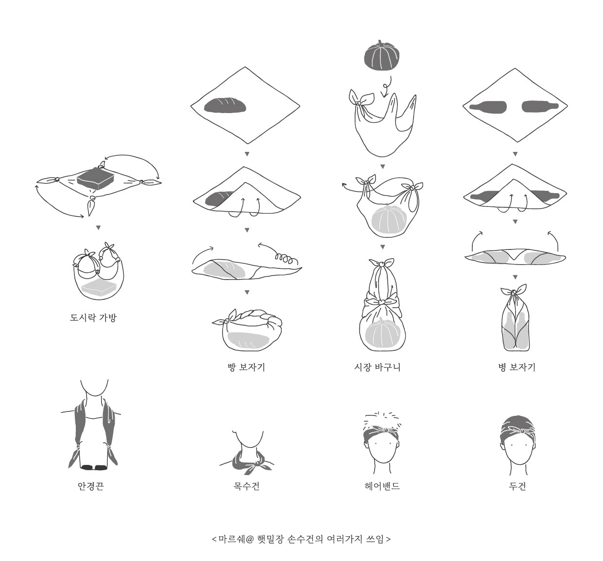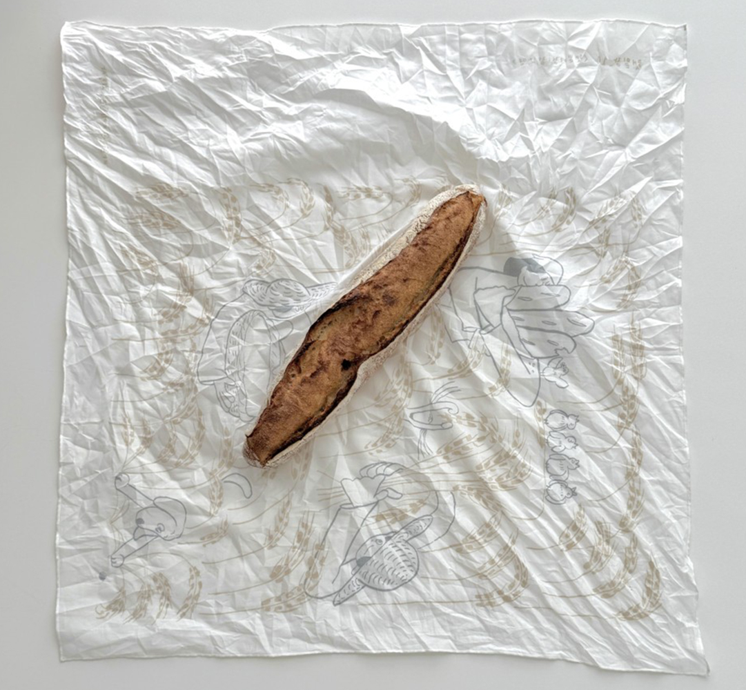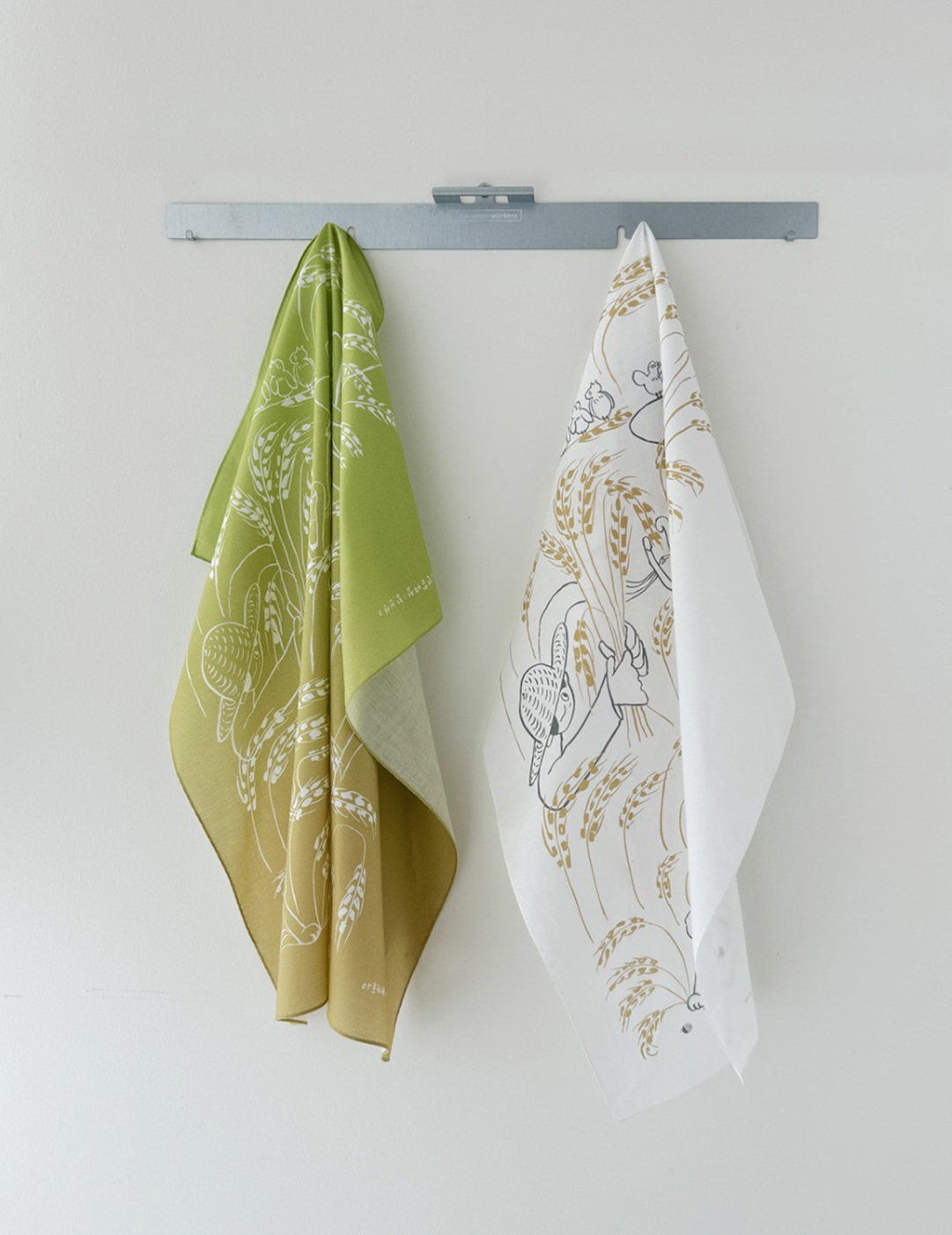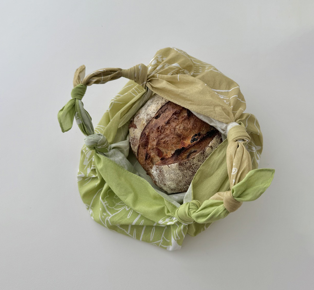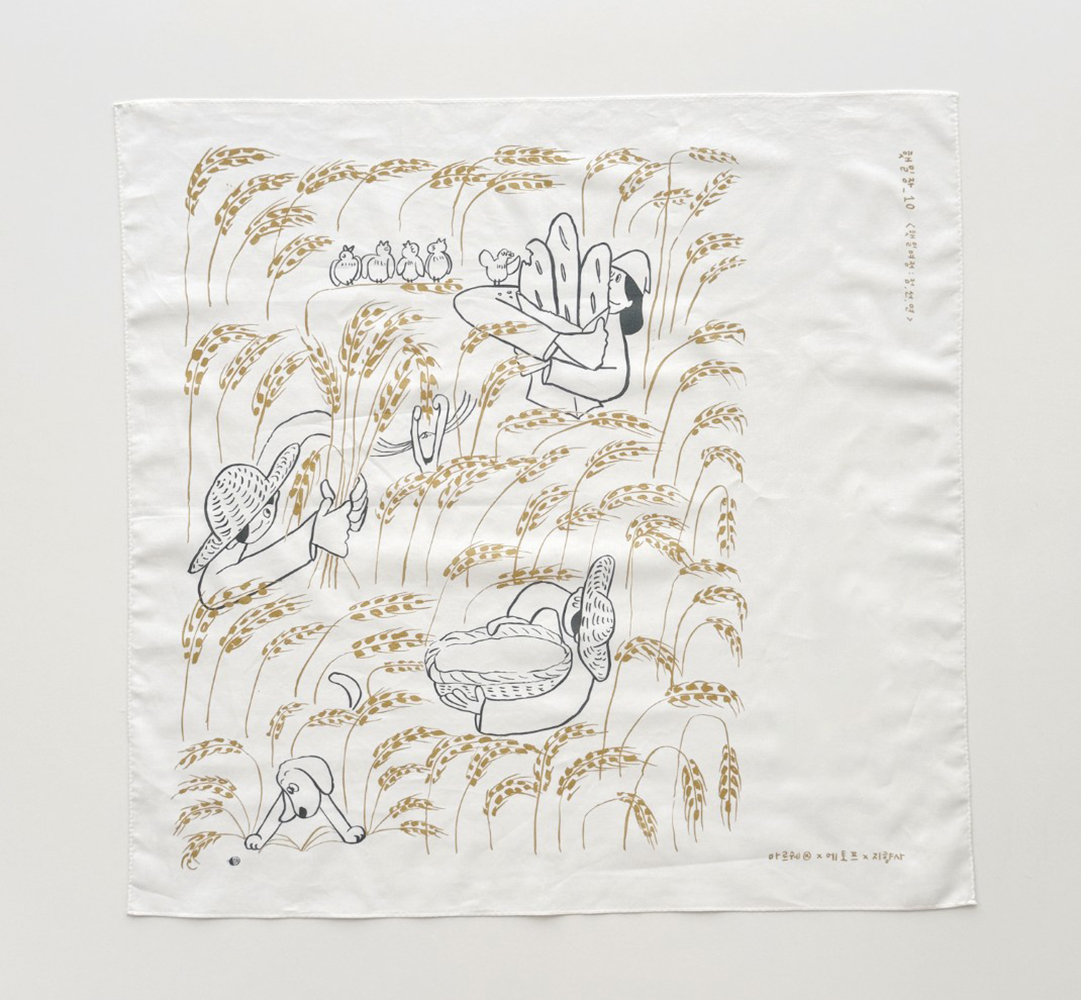 ‘햇밀보자기’는 다양한 매듭법으로 빵, 과일, 채소 등 먹거리를 담는 것은 물론, 작업자의 머리수건, 농부의 땀수건, 부엌과 식탁에서의 키친클로스로도 쓰일 수 있어요. 또 펼쳐 두면 벽, 창문, 선반 등에 어우러져 10번째 햇밀장의 기억을 담은 인테리어로도 남길 수 있답니다.